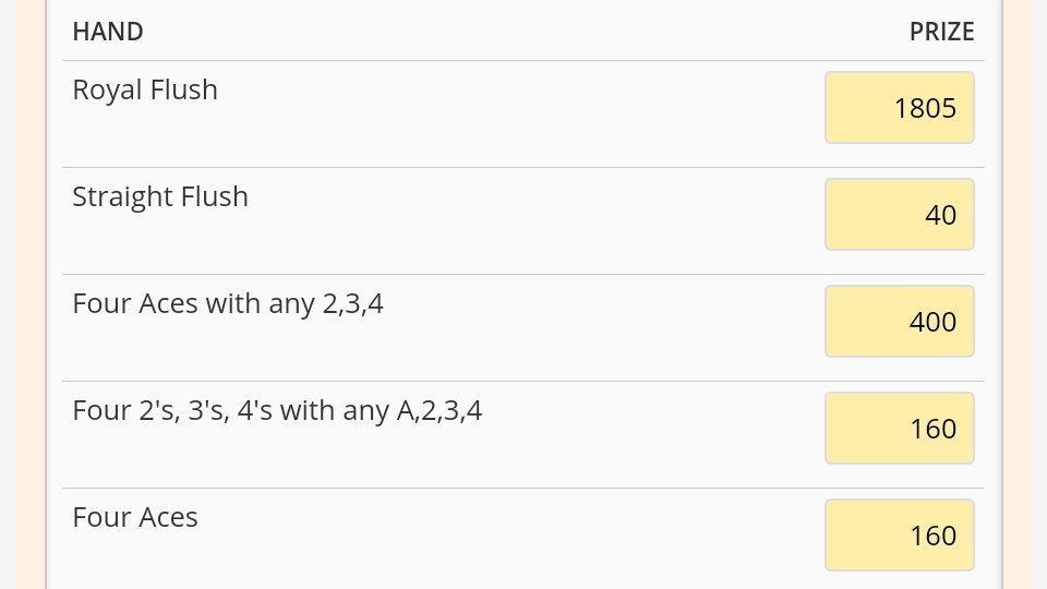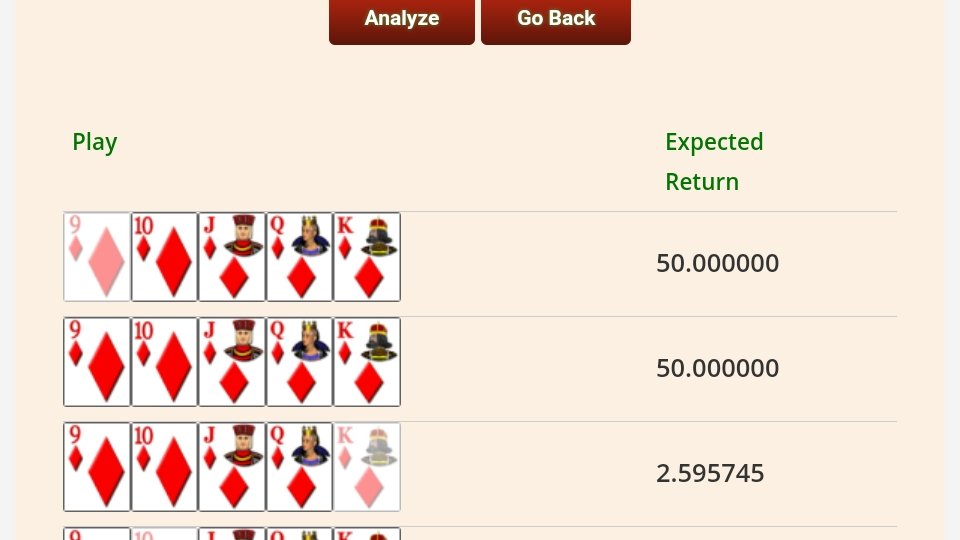 As noted, with no available reference, I figured the SF hold was correct. As we all know folks make foolish, off the wall plays though going for the royal would be a calculated risk given the hand dealt. From a practical perspective, the monetary difference is greater than your calculation when you factor in that a $1530 royal would generate a W2-G thus increasing the tax burden. While the odds of being dealt a SF may be 72,193, what are the odds of being dealt a specific one, namely K high?Waiting4RF wrote: ↑Thu Aug 06, 2020 12:30 pmThe math play is hold the SF. If you go for the royal, on average you will get the royal 1 out of 47 times on the draw for $1530. But if you hold the SF all 47 times, your total won is $2937.50 which is much greater than the royal amount.