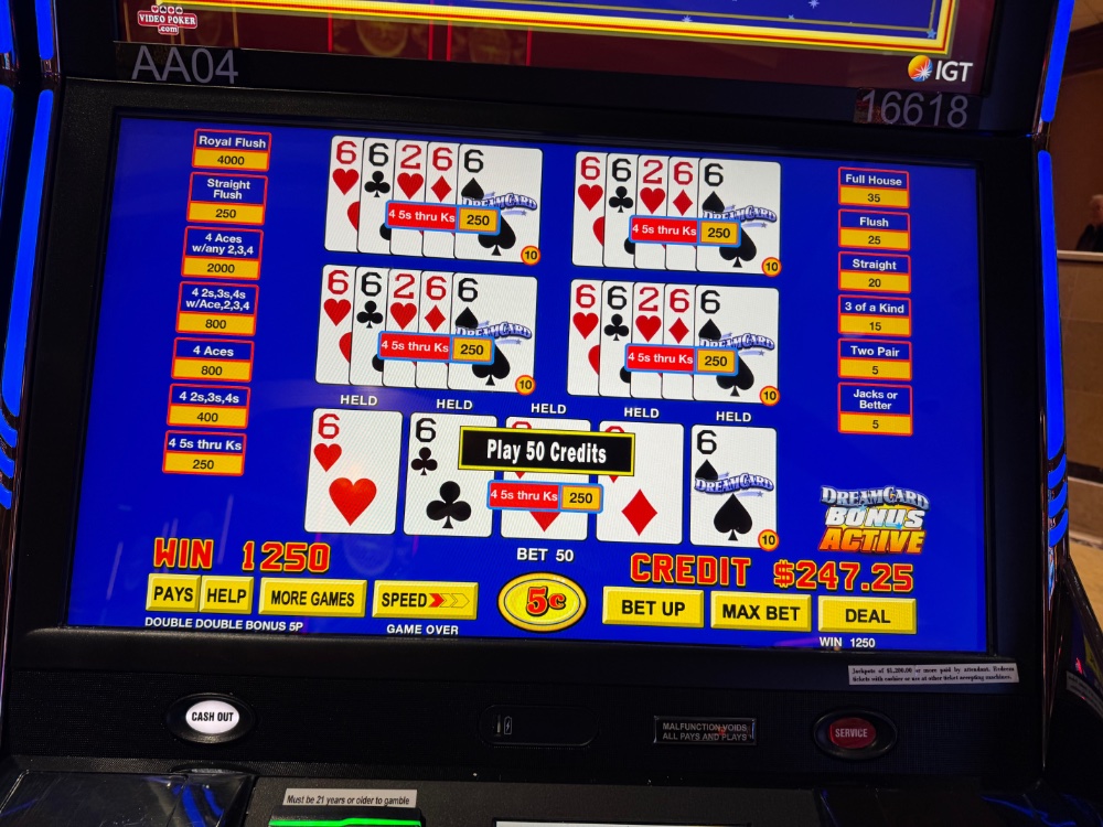 Back to Harrahs’s after 2 bad trips. Turned the table. Went to the VP Bar with $20, proceeded to get into the Shock Wave 4 times. But alas 40 shots, no 4 oak. Ate at Happy Hour at M & S. Still one of the greatest burgers