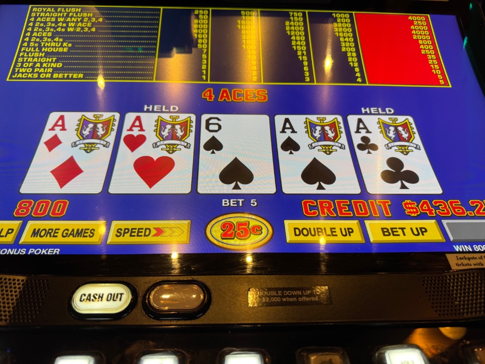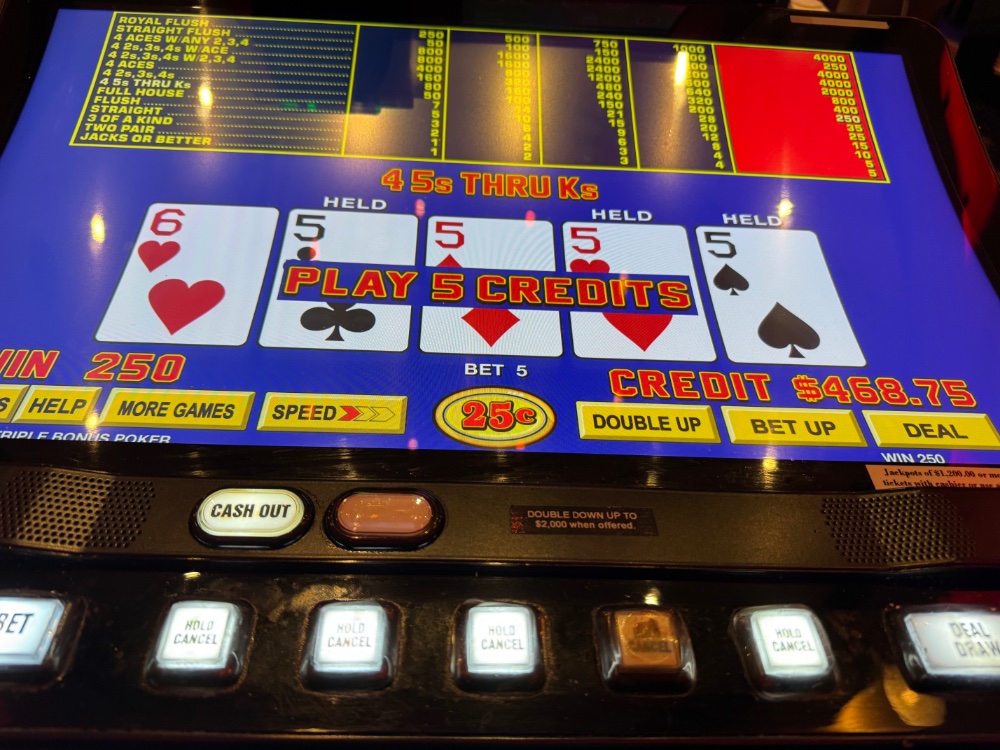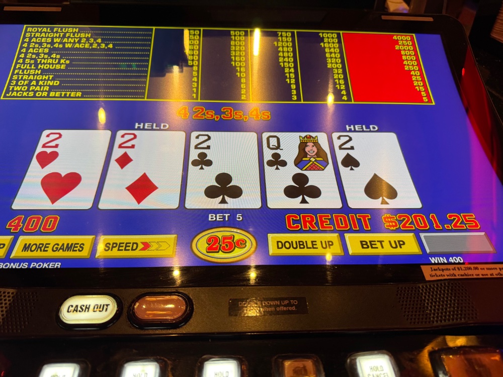 Quarters at the VP bar for two hours is definitely the way to go. Lousy tables, but much less damaging than breakneck dollar play. I’d splurge on Tazza after a jackpot, whatever those are.
