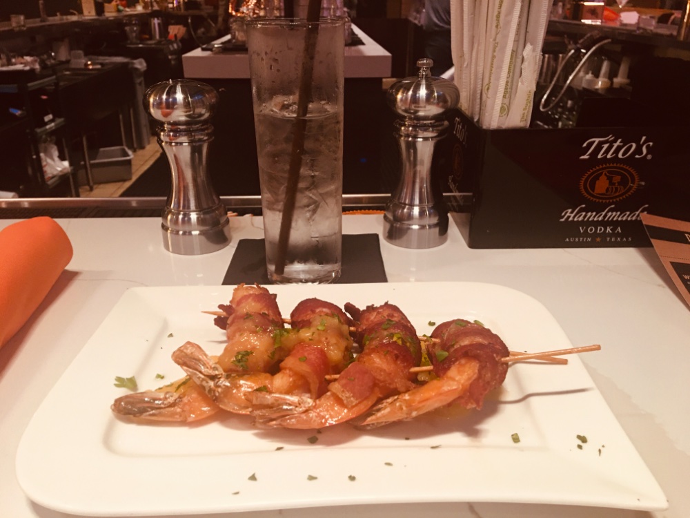 A trio of quads and a craps hit yielded poor profit. Austerity suggests an appetizer to tide me over. Bally’s Water Dog features quad shrimp wrapped in smoked bacon atop an orange glaze. Basil and extra virgin olive oil complete the delectable dish. The trick is using a fork to surgically extract the jumbos from the two thick skewers. Unwrapping them allows one to cut the bacon fat, saving calories. The bar stools cannot be more uncomfortable. But a happy hour win win nonetheless.