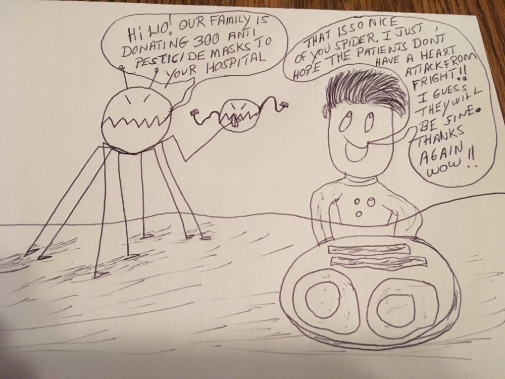 Thanks. For some reason, stiff neck time again. Lots of people I know liked the latest one. My friend who is a high school Art teacher, shows his class my cartoons not for the drawing obviously, but to get his class thinking, he sent this one back to me. Very good here it is. As you can see, his name is Chip