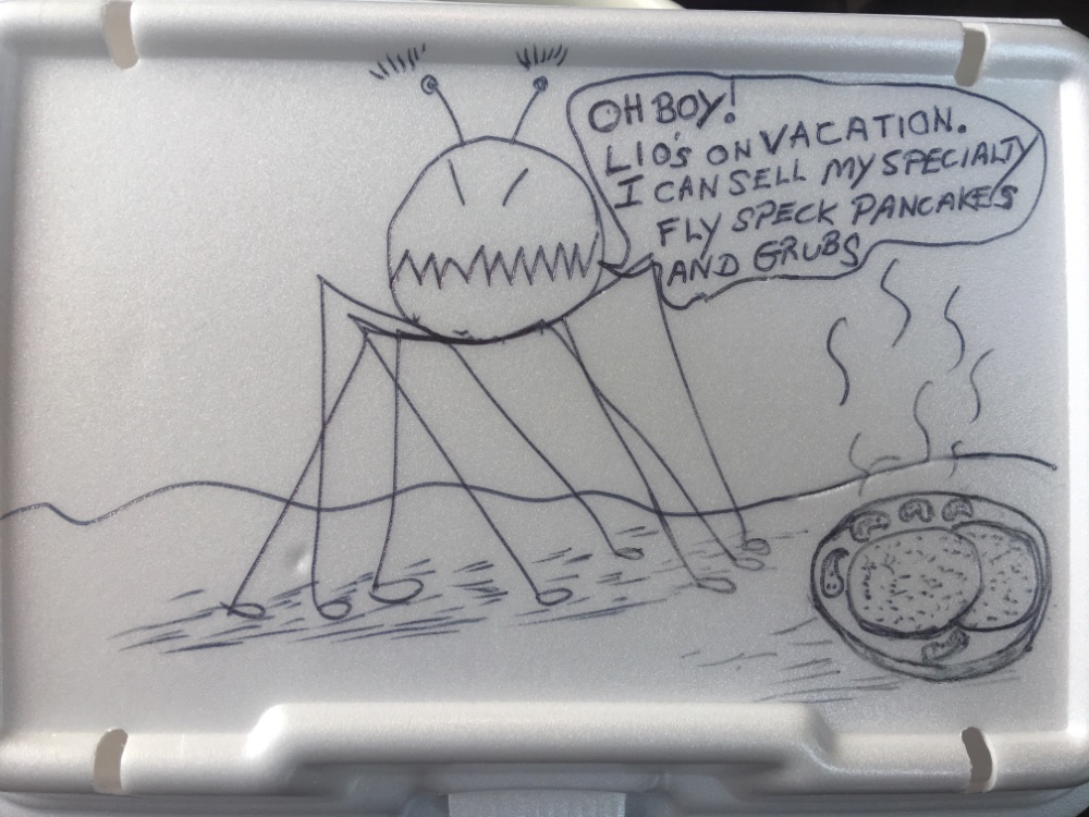 Guess he couldn’t make it the diner with just outside seating and few customers. He did make me a good breakfast before he left. I took a pic of it. Was delicious just too much food. Took the pancakes to go. Enough for both the Mrs and I for breakfast tomorrow. He didn’t say where he was going. I think he wants me to draw a virus free spot for him. I will have to work on that one. This diner/ restaurant is the only one I will go to. Ten minutes from home. Local family run following all of the protocols perfectly and then some. Have known the owner and his family 40 years.