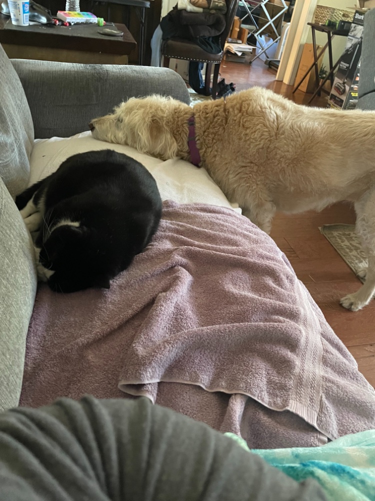 Today, the cat moved over a bit too much and stole Ginger’s spot. Awwwww!