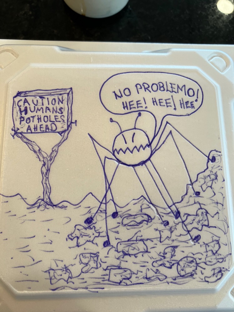 It could mean there are potholes and humans ahead or humans beware of potholes. Hee hee