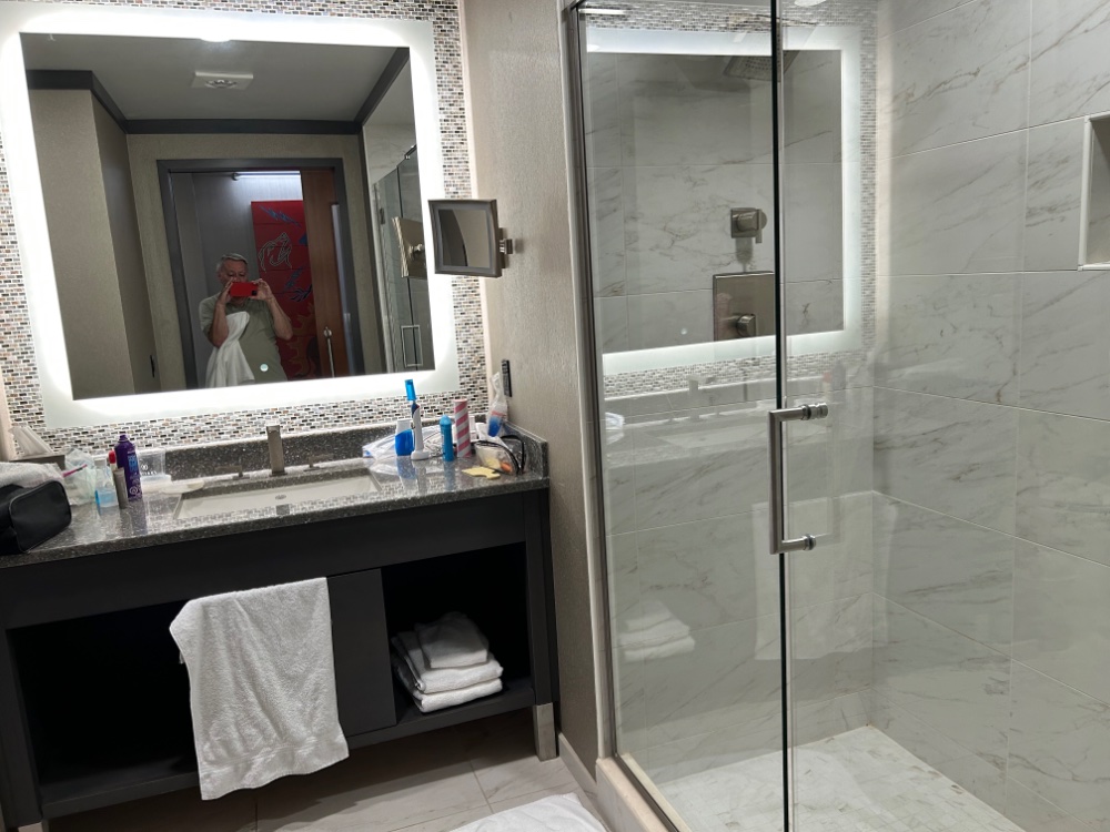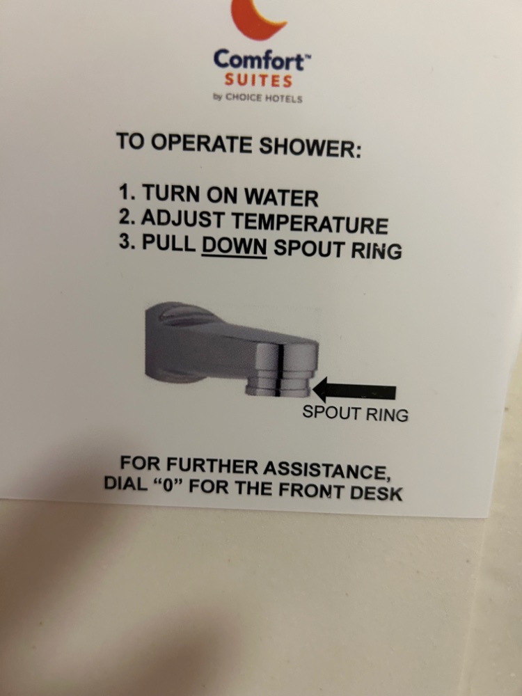 Funniest moment happened at the Comfort Suites in South Bend I Indiana. I am in the shower at 8 am, turn on the water and now I can’t figure out how to turn on the shower. I pull on the handle, shove, twist everything I can think of but can’t figure the damn thing out. Now I am getting old but I still function reasonably well. So I get on my knees and stick my head under the tap to wash my hair then take a bath to clean. M comes in to see what the hell is going on and has a good laugh but she also can’t figure the shower out. Then I get out dry off and spot this message that was covered by the shower curtain. WTH! Who was the genius that invented this.