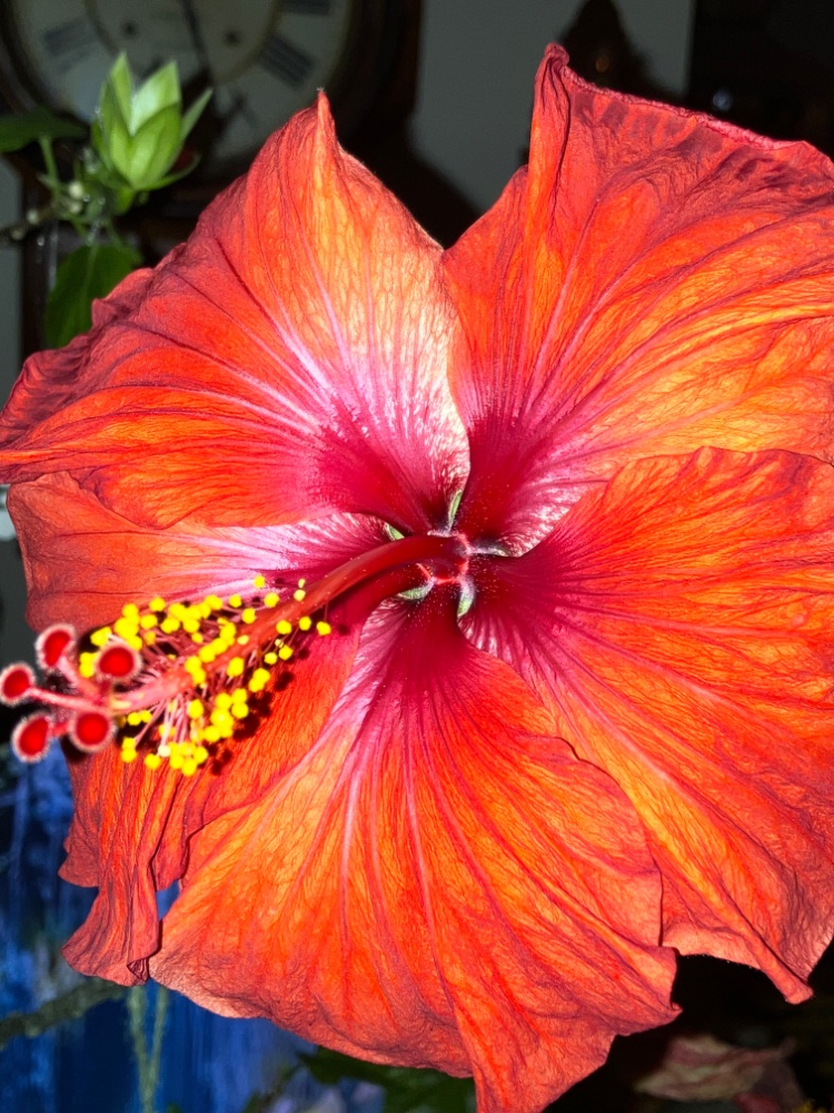 Blooming today indoors. We have to bring it in every winter. It’s a chore now as it is six feet tall.