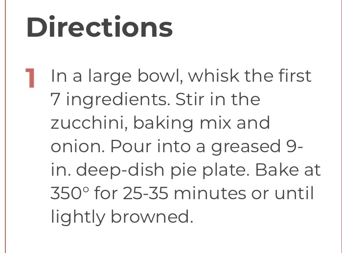 Ok. For some reason, I dont know how to post a link here so I took some screen shots. It is from taste of home website zucchini pie pictures are coming. The Mrs switched out Monterey Jack cheese for Parmesan, but I sprinkled some Parmesan on top of mine. She also added diced tomato. She also used both yellow and green squash, though it would taste the same with all of one color. Some people add meat to theirs we liked it the way it was here are the screenshots. I guess I need to figure out how to post a link another time. Enjoy