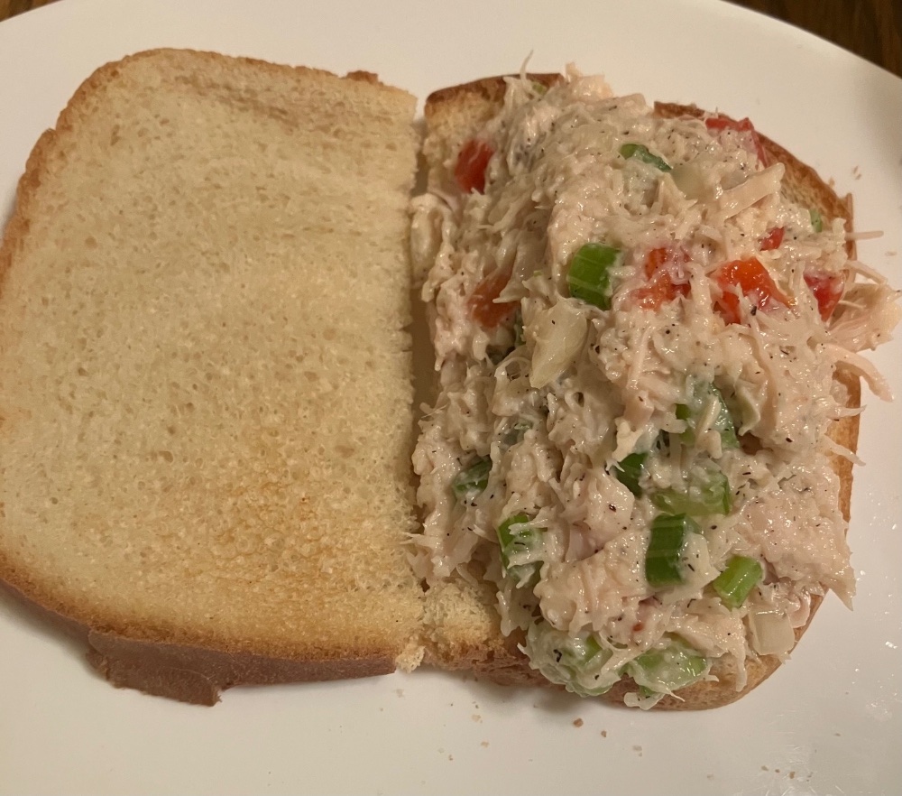 At risk of turning into the Bizarro World Food Network here, the Mrs just made some beat the heat delicious chicken salad we had on toast. White Chicken Breast, chopped celery, roasted red pepper, onion, light mayo and black pepper. Yum. Forgot a sprinkle of red pepper flakes too.