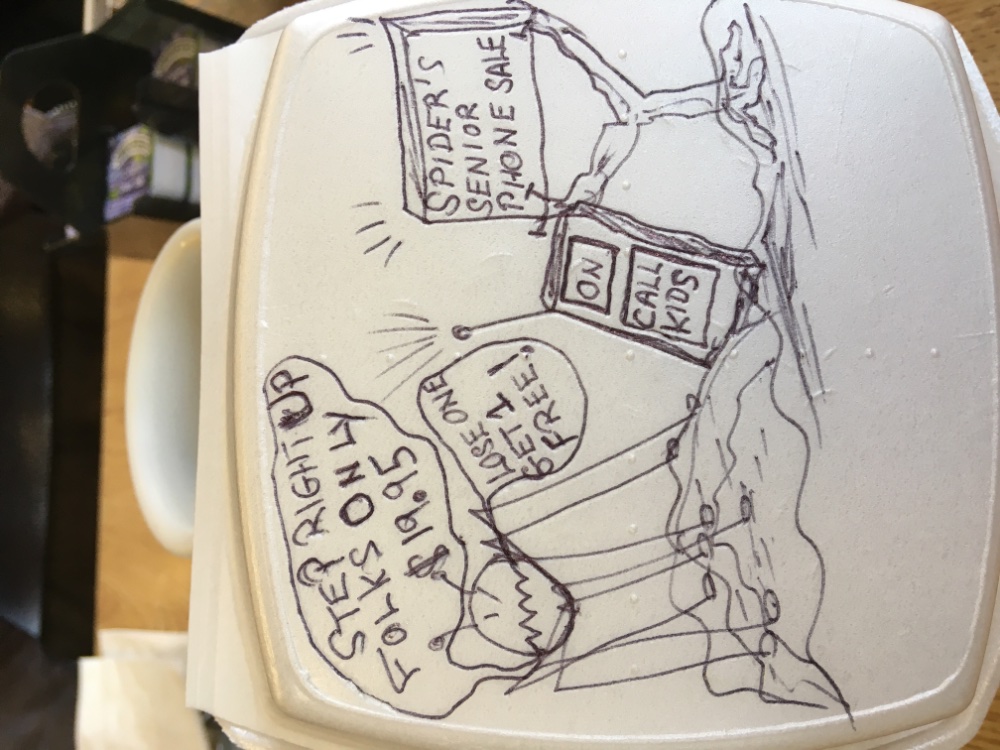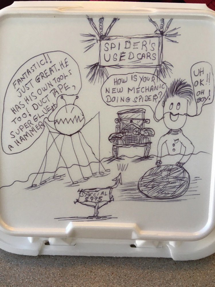 Hi gang. I have been doodling on leftover containers at restaurants and my favorite diners for many years. Just to lighten things up a bit, here is today’s cartoon. I always have rhe same two characters. The boy and Spider. They are lifelong friends and sometimes play pranks on each other too.