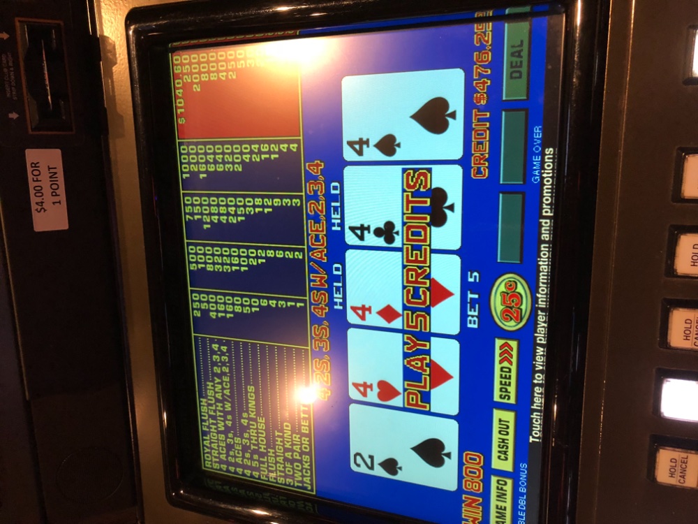 Another somewhat lengthy session of .25c 10/6 DDB single line, around 3 hrs or probably around 3500 hands. It went well hitting two quad aces (once again missed the kickers). I did manage to find a kicker to go along with four 4’s. Hit a straight flush and a handful of quads to end up with a plus +$300. I’m getting kind of hungry for a royal or aces with kicker so likely going to keep at it for a few more sessions on this game, depending on whether variance kicks me in the pants or fills the pockets.
