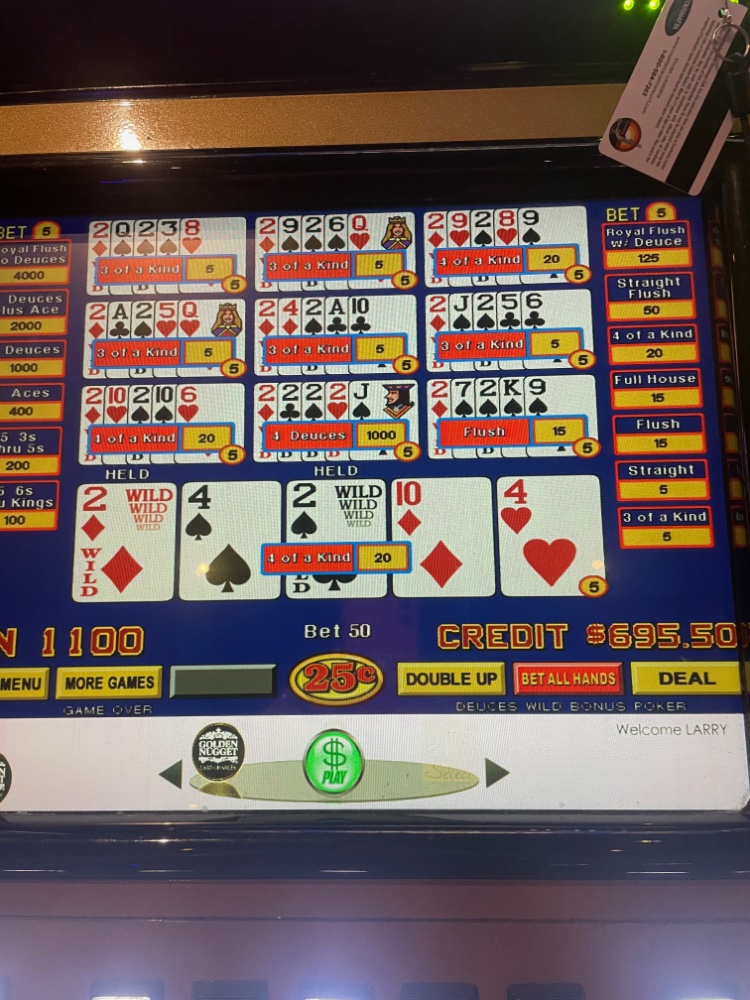 Lots of deuces this trip highlighted by this beautiful dealt 10 hands of deuces. I had already hit several others and missed 3 times on dealt 3 deuce hands so I told the machine it needed to "just deal them to me!" It did and I just sat there quietly for 20-30 seconds and then called Sweet C over to check my hold since it didn't self hold.