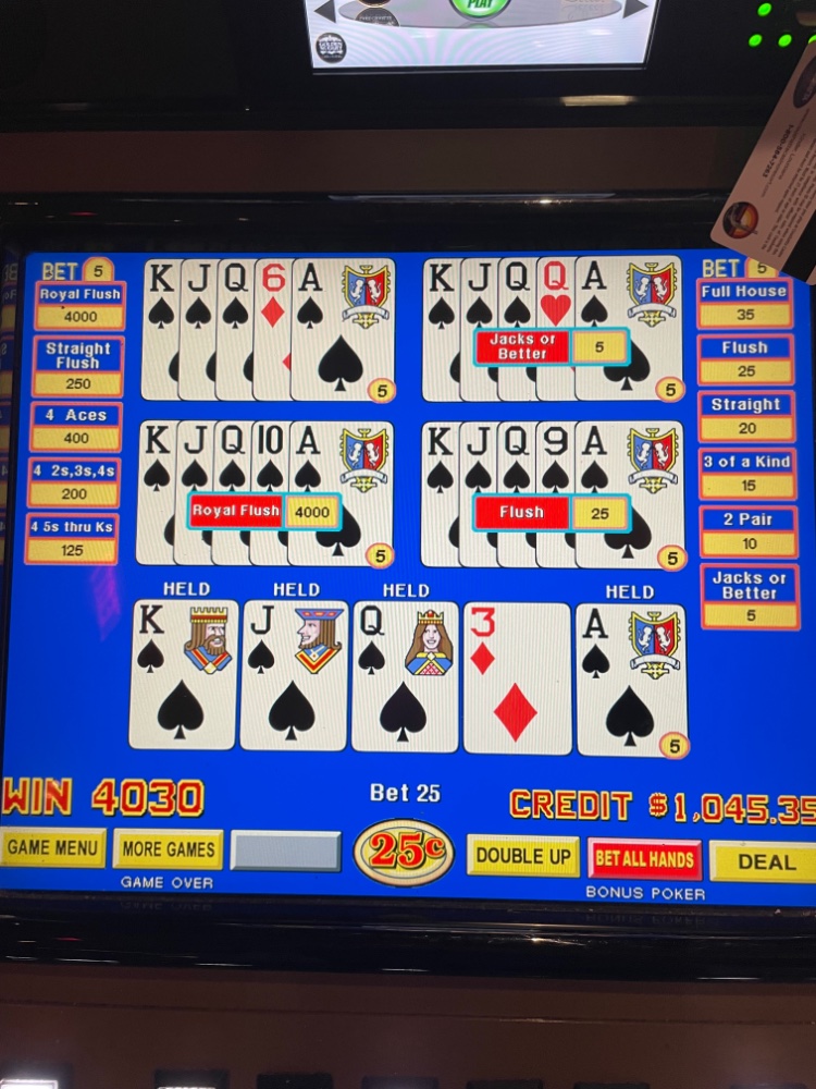 Sweet C and I decided to play $500 per night since we were staying two nights. (Free play can not be played on VP-just slots.) We pulled a little over $600 off night one, split it and hit the VP machines. My luck continued as I pulled a Royal off a AKQJ of spades on a 5 hand Bonus Poker machine.