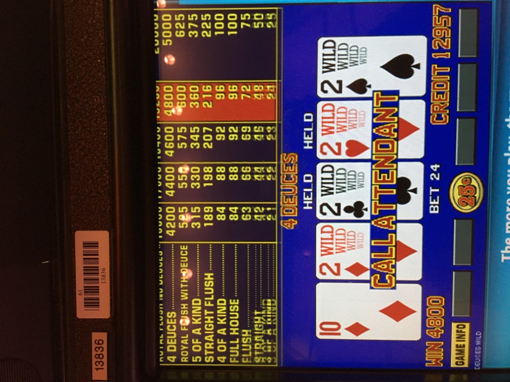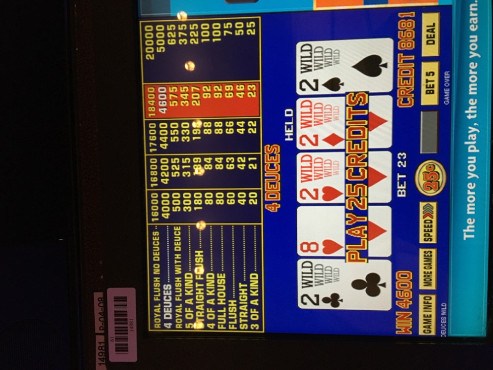 Back from a trip to Mohegan today with the mrs. She didn’t win on this trip playing her usual nickel tripple play ddb ultimate x , but I did fine sticking to quarter martingle clone deuces wild. Two pics with the best hits are attached. All play was on one machine and it never came close to busting my 500 buck budget. i’m overdue for a royal again, but am quite content hitting the quad deuces just when i need them.
