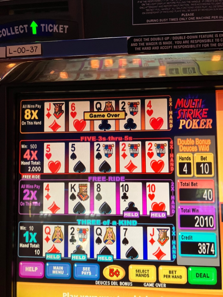 I actually like holding 2 pair because if I discard a pair, I feel like I wasted it. But I do whatever the strategy says. These days I play either 98.9 or 99.7% Deuces with 2 pair as the correct hold. In earlier times, I put in some hours on FPDW where 1 pair was correct.olds442jetaway wrote: ↑Fri Oct 20, 2023 4:55 pmOne particular annoying thing on Deuces Wild is the strategy requirement that you try for the full house when it pays 4 for one like on airport deuces. I always do go for the full house, but in an off cycle like today before I came home I must have whiffed 20 or 30 times going for the full house.