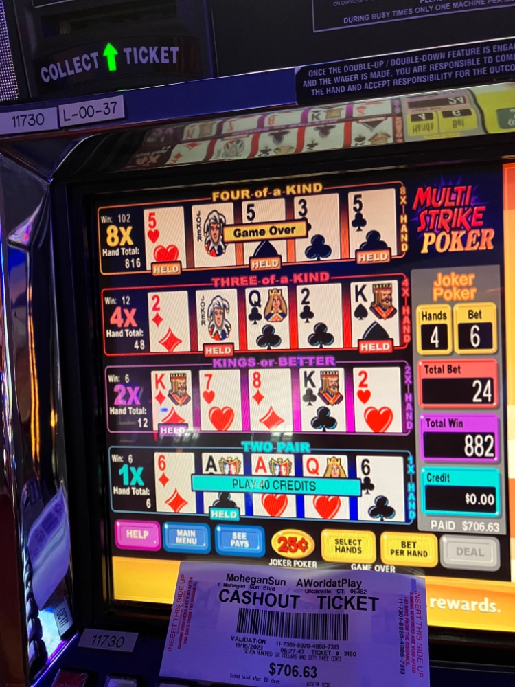Solo trip planned for later tonight. Hoping for an instant replay. Will be trying the same Multi Strike machine. Nickels. Max bet on this machine is ten per line so 2 bucks to play all 4 lines. At least it pays the correct Royal amount for bet 5 per line. 98.44 Joker Kings. 17/7. Star
