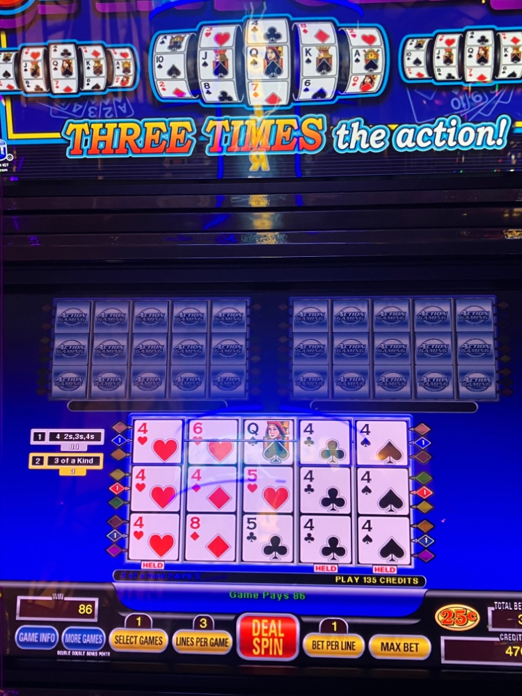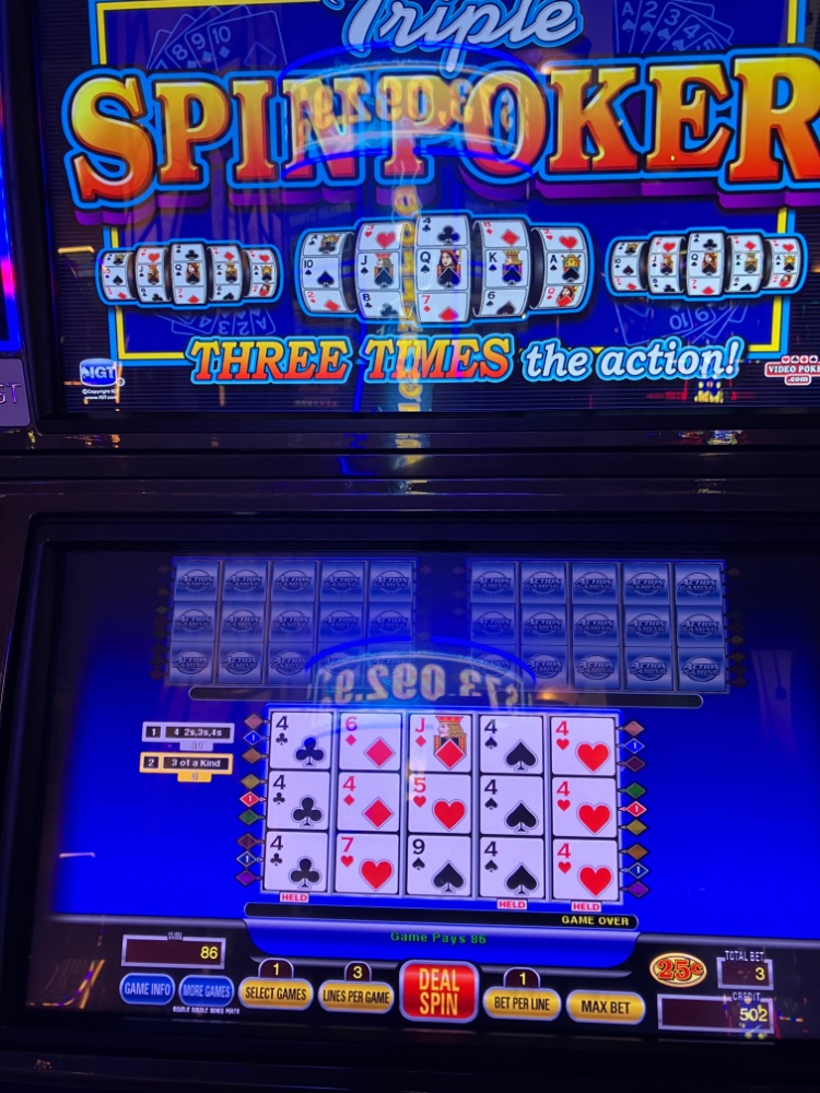 Back with the Mrs from Bizarro which again lived up to its name. I started off with DDB but after nearly identical hits, it got ice cold and scooped up a hundred like a street sweeper machine. I bailed on that while the Mrs continued her marathon DDB nickel ultimate x. Then Bizarro got even more insane. I opted for a single line 9/6 job the rest of the trip using quarters but with the Clone. After leading me down a dark alley, and 29 straight hands without even 2 pair, it did something I have never seen before live or in practice. In 20 minutes of play, 12 quads and almost too many full houses to count. All on a single line game. Still shaking my head. After cashing out, I think the trip was just a bit to the plus side. Nice room and good food. Also the casino is still being kept immaculate throughout.