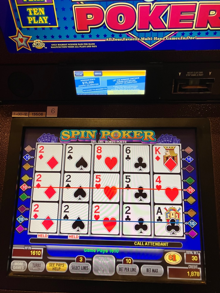 I went back up Thursday evening and played dollar DDB which I never do. I guess it was the Mrs track record compared to mine that convinced me to give it a try. On my 800 for one machine, I could only get 9/5 not 9/6. I came very close to getting a dealt Royal ( pic ) Hit 4 Aces once, but overall was on the ropes and near the end of my rope as well when the hand pay came in. ( bet was way too high ) but that’s where the Clone took me. I ended up even after 7 percent for the stupid State withholding. ( my choice ) to avoid a big estimated tax penalty. I didn’t play Ultimate X which the Mrs prefers. I don’t think my bankroll would have held up unless I had other high multiplier hits along the way. On the way home, today I just missed hitting a coyote wolf hybrid on 95 in Old Saybrook. Literally by an inch or two. Ran right across the front of my car from the woods. Something told me to slow down from 70 to 55 and I did. Seconds later…..there he was. Big too!!