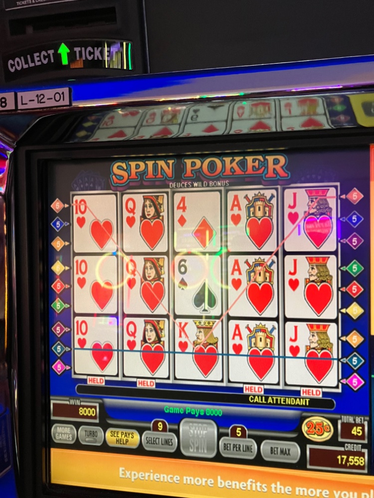 The return over time for the same amount bet is the same on spin poker as a single line game assuming the paytables are the same. My machine had nailed me for 1500 bucks and I was over my limit. That’s why I went to the quarter game. Same bet pattern with the clone. I would have busted on the dollar machine given the same pattern the quarter one had last night. Not that it matters because in the short run anything can happen, but no nickel or dime games played yesterday. The name of my game is to manage money without busting and hope for the best. Since I subscribe to the theory that a long run can be longer than one’s lifetime, at any given moment I don’t worry all that much about a bad pay table. Of course I prefer a good one. The Marathon was not planned, but after I got slammed on my favorite machine I went into survival mode and hoping for either Dealt quad Deuces or a Royal. I actually started both machines at 3 lines betting one a line. Ten times is still too steep of a bet increase. Meaning a net loss of ten times of your current bet level. You can see where it took me. Even on quarters I was up to betting over 10 bucks a deal. My dollar machine would have called for 45 bucks a deal. I would have been out like a light.