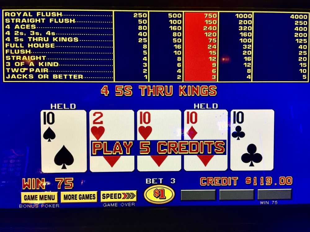 Fine Friday. I lost my $25 Caesars table FP on a four to out. I won $15 on $25 machine FP. I left +$40 after a max quad. Regrettably, all returned at Resorts despite a small quad. Lunch at Rockets. Back at Caesars, machine did well until I lost $45 in a furious dud streak. I hit dollar BP and it hit back. I parachuted to safety with a max quad deuces. Net Day: +$71. 29 TCs.