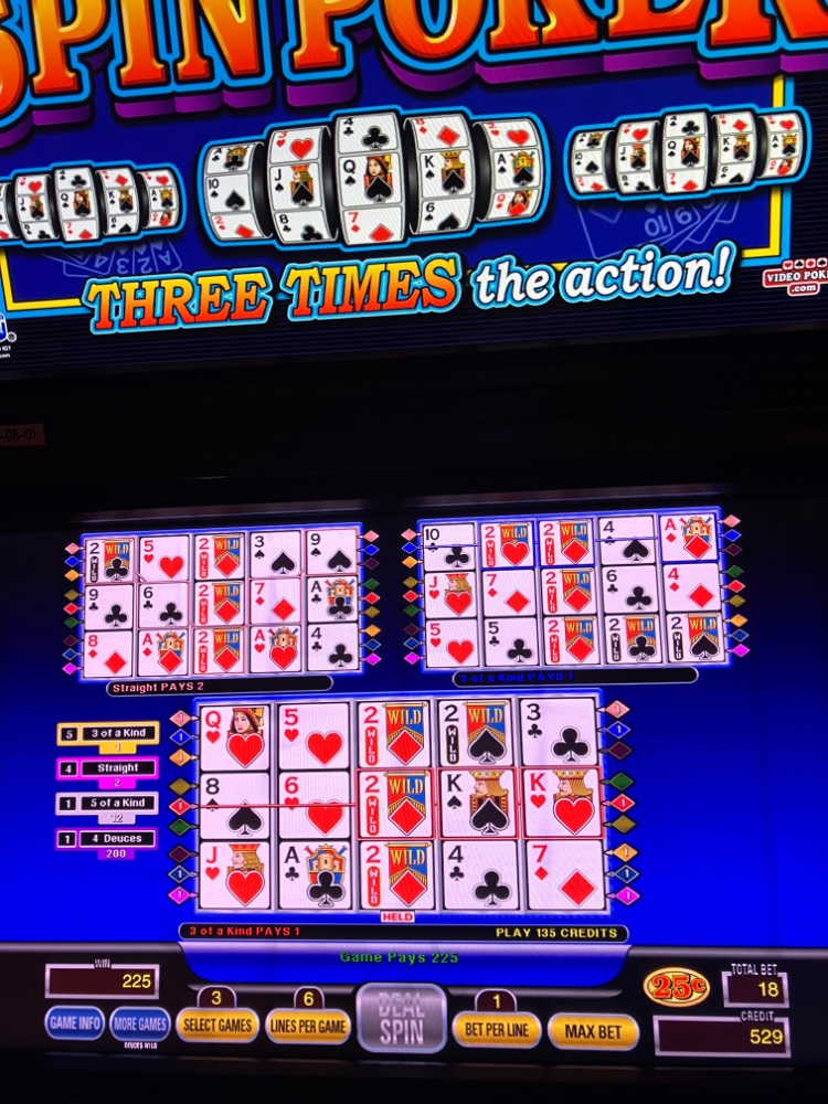 Back home now. Will be stopping at the Animal Shelter tomorrow. If I have time, I usually try and play a little after lunch before going home. Sometimes just enough to buy a cup of coffee. Today I left the dollar machines alone and played some Triple Spin Poker which I have been doing very well on. I still hesitate to play it as the quarter game is only 97.5 and the nickel one is 96 and change. However, I have toned down the Martingale Clone to the point where I think I can grab a few bucks and run without busting bankroll. After losing a net of ten times my current bet on regular Deuces Wild, Ny next bet is up a line, but not upped on the amount per line. If I run out of lines though, upping the amount bet per line could become necessary and lines bet would go down some. Note. These are 800 for bet one machines or I wouldn’t play them at all. Three pics are attached. One has a Royal hit on one line at bet one. I went home a few minutes after that. I started with 100 in a free play award and 25 award on my wife’s card that I played with too. At least I got her into Leap status. She might get a bit of free play and can get into the lounge on her own now, though she never goes in without me. I made out well on the free play this trip due to it being Triple Status points yesterday and today. I got a 100 award last night and another one today. Also 25 each session on my wife’s card. Thanks all for the cheering session. It worked.