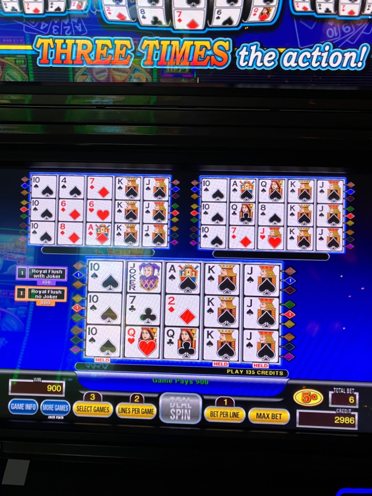 It was only 940 quarters, but I had mentioned earlier it would be a budget night. I had a light lunch and on the way out decided to play an All Star 2 machine for 15 minutes or so. I am using the clone here just like the other hit. This is a poor pay table, -and even for the Royal,it gives 800 instead of 940 for one. Could be worse. Could be just 250 for JOB or 400 on Joker Kings. The clone seems to work the best on the triple spin poker games. I was betting 30 cents here, but hey! I will take 50 bucks for 15 minutes of play.