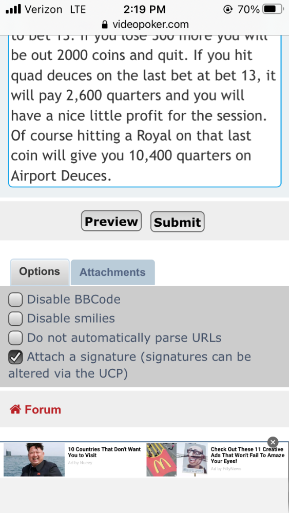 The Mrs and I are at Bizarro tonite for an overnight. Having dinner now, but will be playing shortly. I will force myself to stick to the above method and post what happens. 2,000 coin loss limit if things go badly. All I need is one quad deuce hit at any bet level and I will be ahead. Talk later. Fingers crossed. Of course a Royal would be awesome. I am going to start with betting just a quarter as I will start out on an 800 for bet one machine. If the bets get past bet 5, I will switch to a 15/9/4/4 machine for better odds than 12/10/4/4.