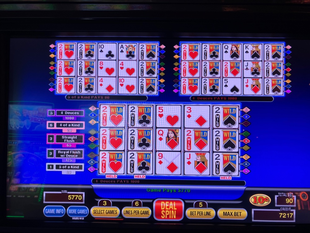 Thank you. So far so good. Playing either nickel or dime Triple spin poker. An inferior paytable at around 96 percent, but so many options with my Martingale clone. Up. Down up down as the wins and losses come in. I had 200 in this machine, so this was a nice win. Now time for a break and maybe grab a coffee and cookie. ( just one).