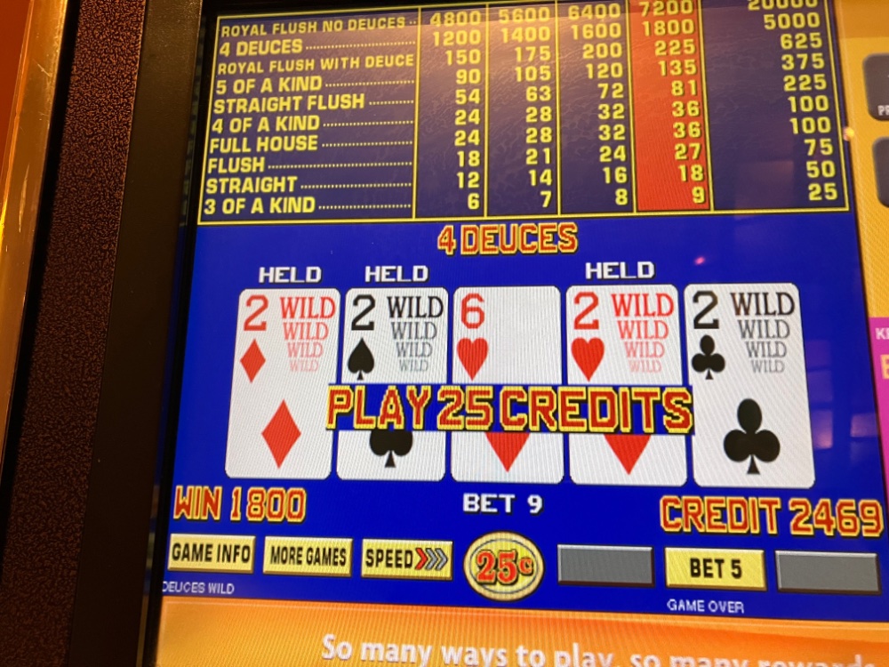 Home now. A really good trip fr a change. I also caught deuces on quarters, but the highlight was the Mrs ( Luck of the Irish ) landing quad Aces and low number quads several times, a Straight flush with big multiplier and this almost unheard of beauty. Aces with a kicker and 12 multiplier. Also her first hand pay in years and first ever on nickels. The slot attendant said he never saw anyone hit this before.