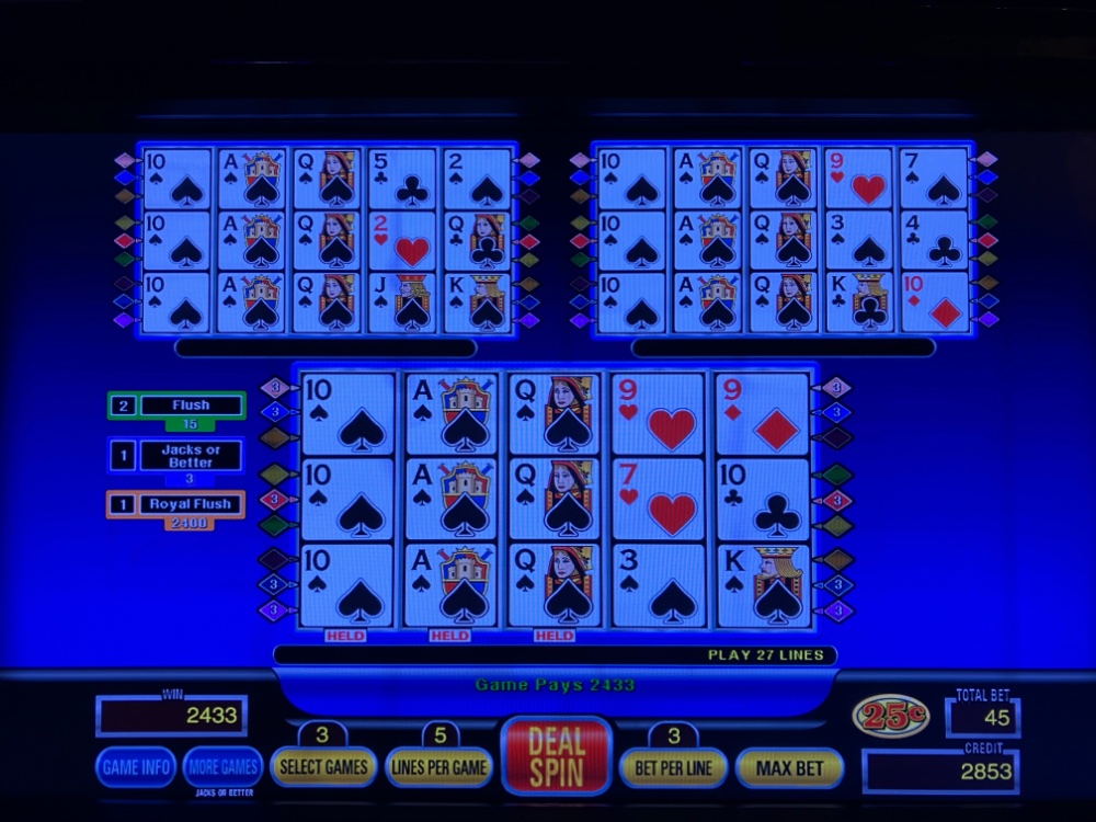 Finally caught a nice one. Last Royal was 270,000 hands ago. Can only get 8/5 Job with the triple spin poker, but it works pretty good with the Clone. Now, the trick is to not give it back by morning. I’m taking a late dinner break in the lounge. The broccolini is the best day ever had. Sorry about the dark picture. It’s dark in there. Earth High limit.