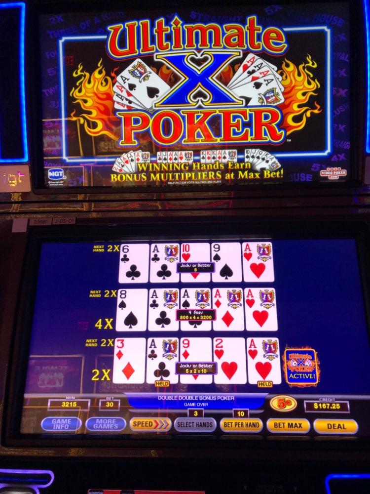 Maybe the leprechaun was listening this trip or read my post above. He almost took all of the Mrs credits, then gave her Aces with a 4 multiplier for 3200 nickels. That almost got her even, but not quite. Realizing this within a few minutes he gave her 4 twos twice, one with a kicker and low multiplier. I only have a pic of her Aces, but she ended up ok for the session.