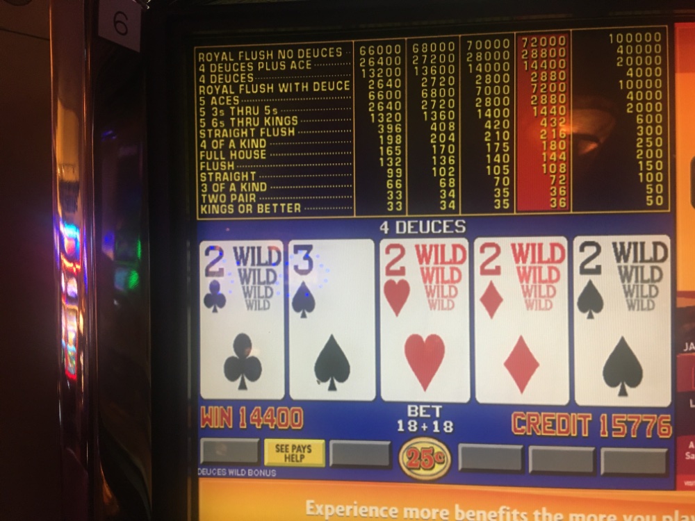 Up there tonight for an overnight solo. Put another nice dent in my huge 2022 vp deficit. Such a strange game we play. Unfortunately, my deficits are compounded by the market, but I guess many of us are in that boat right now. Hard to tell from the pic, but the game is Bonus Deuces Wild Double Down Stud so the quad deuces even with a quarter bet after doubling pays 200 bucks. Of course they have to be dealt. I think the frequency is about the same as hitting a non dealt Royal in draw poker.