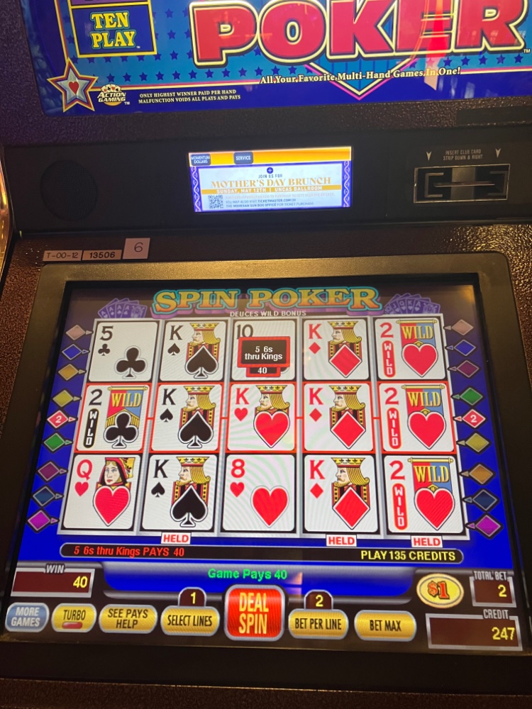 Max I win at Bet 3 is $750. I’d never want to leave the Sun. Of course, I’d have to learn your games. Very severe discipline. $1 until $100 has been exhausted should keep you at the machine forever. I don’t see you losing much more than $100. Rocking chair trip.