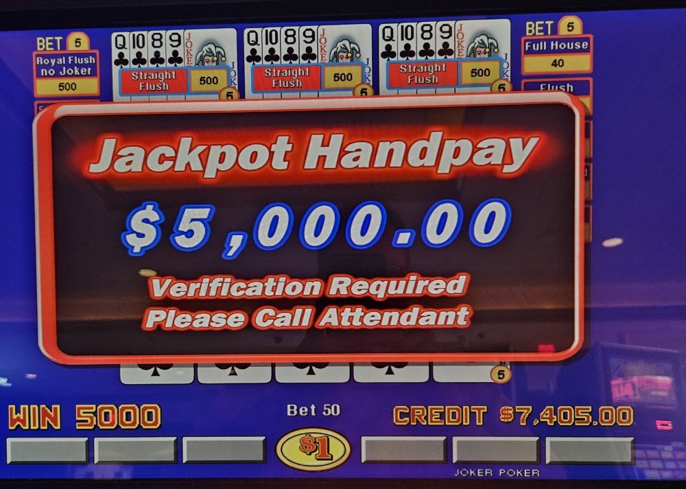 A couple minutes in: This put me about even for the night and re-armed for more battle, I pressed on. Doing my usual TDB - ACJP flip flop, then: I'm now in happy dance land and while still clutching the payout receipt waiting to get paid, much to my surprise: After getting paid for the two jackpots, I lost back about 1k before calling it a night. Paid my $20.00 rent to the cocktail server working the section and I went home much happier than I envisioned a couple hours earlier.
