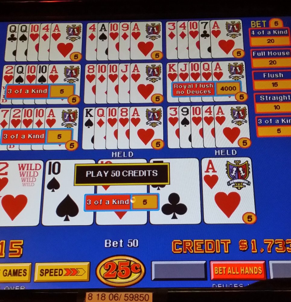 Very few of us make money playing VP, so there must be some other reason we play the game? My wife and I play VP because we enjoy it. The thrill of hitting a royal flush is the second best thing can happen when you play VP. The first is hitting more than one royal in a day. Modifying the game like my wife does gives her more chances at experiencing a royal. She wouldn't hold an A-10 if she was playing a non wild card game because the cost is too high. With 4 wild cards in the deck, the possibility of a good result is substantial. Three or four of a kind, a flush, a wild royal or a natural royal are all possible. A 3-4 cent penalty is not going to make a difference in her attitude. A $1,000 royal flush will.
