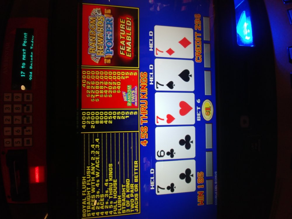 I sat down at a VP machine Saturday and, as is my custom, I played a hundred dollar bill on $5 denon before settling down at $1 denom/$5 denom rotation for the rest of my session. On my second hand, I was dealt 4 aces with a kicker for $10,000. As I said, I have had this hand before, but always I had to work for it. Nothing like a dealt on the second hand of a session to wake you up and get the ole heart thumping! (I have a photo of the dealt hand but unsure how to upload it. It is on my iPhone, which has text, internet, etc, but I have not used it for email. Any advice or instructions to post the hand would be appreciated.)