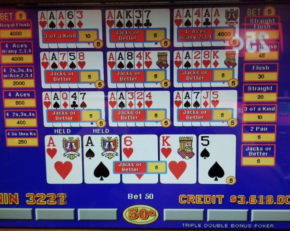 When I first arrived to the casino I went to my favorite bank of machines, only to find that my favorite of the 4 was being played. The gentleman was playing 3 hand single coin and yes, he did hit a diamond royal. He then upped his play to 4 coins. The money he won from the royal shriveled and he soon left. In the meantime I was playing the machine next to him and I was holding my own on ACJP, hitting a couple 500 coin straight flushes. Once he departed I then slid over to the now vacant machine and proceeded to hit those in the pictures. I also hit several more straight flushes in ACJP and I was dealt 4 to the heart royal twice in TDB but failed to connect on any of them.