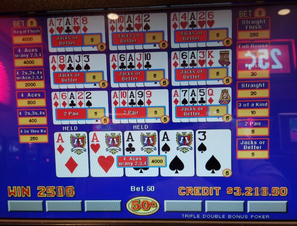 When I first arrived to the casino I went to my favorite bank of machines, only to find that my favorite of the 4 was being played. The gentleman was playing 3 hand single coin and yes, he did hit a diamond royal. He then upped his play to 4 coins. The money he won from the royal shriveled and he soon left. In the meantime I was playing the machine next to him and I was holding my own on ACJP, hitting a couple 500 coin straight flushes. Once he departed I then slid over to the now vacant machine and proceeded to hit those in the pictures. I also hit several more straight flushes in ACJP and I was dealt 4 to the heart royal twice in TDB but failed to connect on any of them.