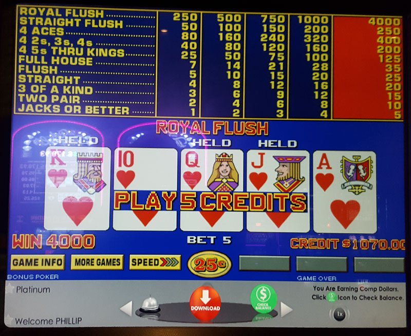 After years of experimentation, I think I have something I can live with. I switched to Bonus Poker about a year ago and good things started to happen for me. My issue was always extending my play without extending my losses. This is difficult in the negative game world I have to play in. I also have a problem sticking with quarters as I enjoy the possibility of getting a hand pay. The deuces wild game I played for years was very entertaining. Unfortunately, if you don't hit a quad deuce the day is going to be a bust. I can have a bad day playing Bonus Poker too, but they are much less frequent.