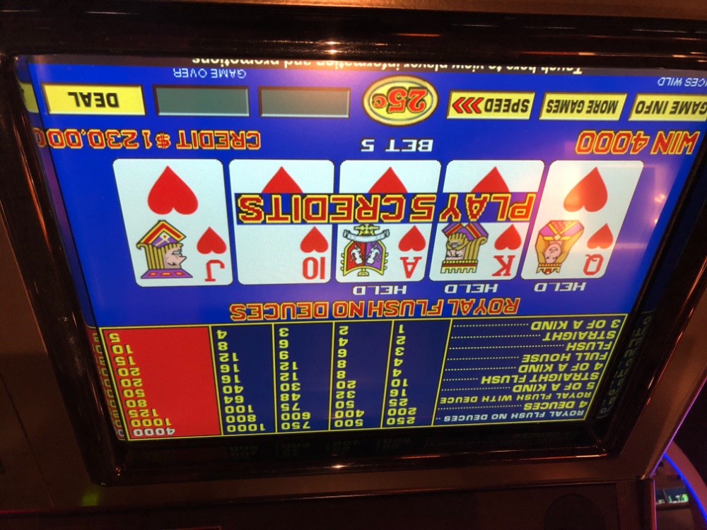 Although not posting as much, I have to share the crazy night I had last night. It started with .25c nsud with $285 and ran it up to almost $400 just hitting a lot of 5 oak and dirty royals (with deuce). The 10/6 .25c DDB keeps attracting me but keeps kicking my behind. I cashed out of nsud and went to that game. Hit aces no kicker fairly early and was up to around $500 and then had a semi-long battle to zero. This is about the 4th or 5th time in a row 10/6 DDB had my number, and I was tilting a little bit. I had $250 left in my wallet, decided to throw the dice on loose deuce .25c (deuces worth 2500 coins). First spin, I save two deuces (I see where this is going). Sure enough, bam, 4 deuces on the first spin. So sick. So cash out $850 from that game staring with $250. I decide to go play 8/5 bonus poker .25c 5 play wheel poker. Hit two quads but then hit 4 deuces for 200 coins and spun the wheel and got an extra 1000 coins. Decided to play it out and ended up dropping back to the original $850 and cash out even. Then decided to throw the dice with $200 on $1 triple play ugly deuces. Drop the $200 fairly quickly. Then decided to play a little buffalo gold at $3 a spin and hit a bonus worth about $600 but keep playing and cash out up $209 which made up for the $1 triple play sour gamble. But not to be done, decided to play .25c triple play dream card deuces. Supposed