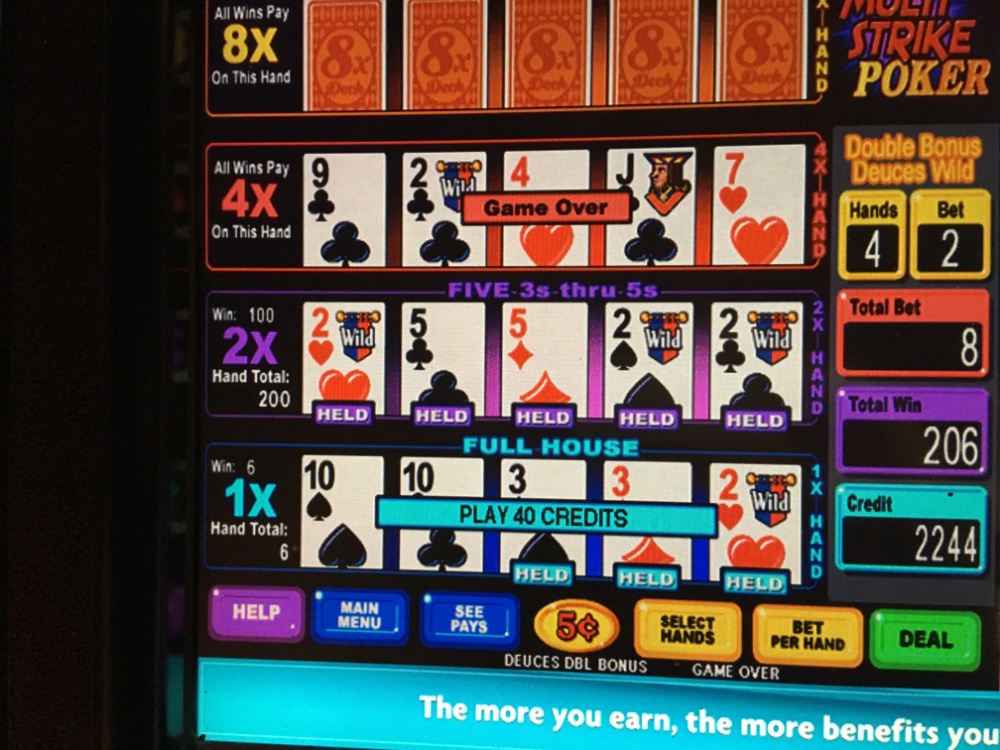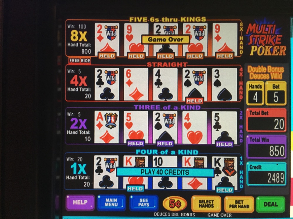 I’m playing nickel double bonus deuces wild multi strike poker started with my last 100 after that one hour 300 buck bath. To be able to maybe last out a big dud run, I’m forced to short coin Started with 2000 nickels. Just caught 5 of a kind the good low one at 50 for one That brought me up twelve bucks