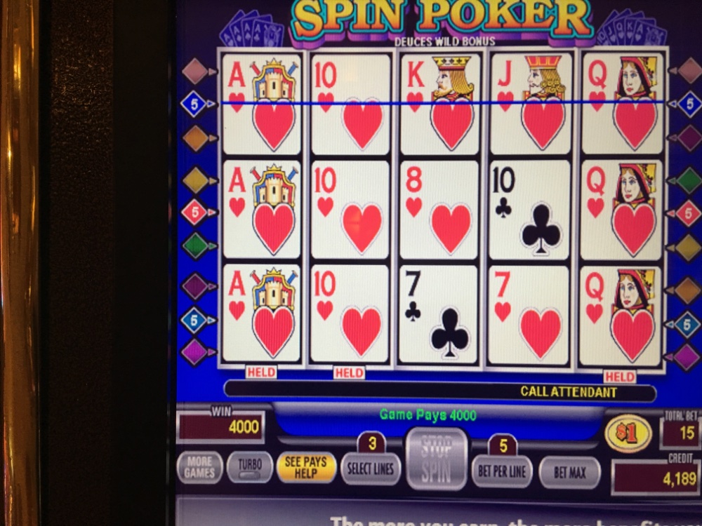 I guess they’ll have to eat my own words. I hit This royal flush with a Joker early today on quarters. I was playing my usual martingale clone. I cashed out of quarters Up a Nice amount and decided to go over to my favorite 800 for dt 1 Dollar machine. I decided to just spend a dollar a time on the Center line until I caught a very long dead streak. When anything more than a push hit, I had budgeted 10 consecutive plays on three lines. I just couldn’t believe a royal came out again like the other day. And a huge one at that. All went home less $200 and the horrible 7% deduction for state taxes which I will never see again.