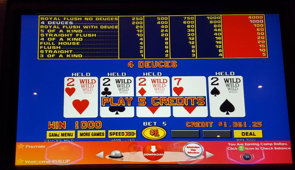 The variance of Deuces is so low I can play all day without running out of money. I normally hit a few royals a year at quarters. When I switch to dollar play, any significant hand makes money as long as I don't feed it back into the machine. Those two $1,000 quad deuce jackpots are like hitting two extra royals at quarters. Here's the good part, No W-2Gs!
