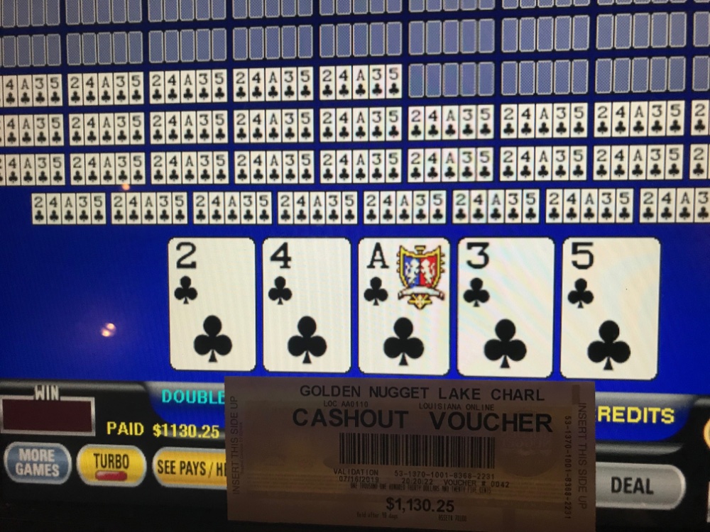 Since I play mainly DW/DWB 99.5% of the time I don’t see as many natural SF as most people which is why I jokingly stated they seems harder than Royals. FAA my apology on saying I rarely catch a straight flush. So I decided to play a non-Deuces game (see reason I'll post topic "Golden Nugget" trip 7/16" and I caught a SF - 35 of them to be exact. The second picture also has the cash out ticket with date/time. Sorry about the darkness around the ticket.