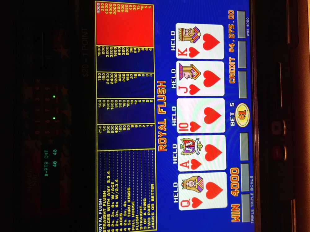 The new VP.com Pro Trainer has Triple Triple Bonus on it. I used to play TTB a few years back, but for some reason got away from it. To my surprise, my accuracy rate was still pretty decent, with most errors being when to hold a 3 to a flush with royal cards involved. Anyhow, I was feeling lucky and decided to hit up the local after work. After loosing $300 at a 60% payback rate, I was shocked when she locked up. First ever non-Dream Card dealt royal!