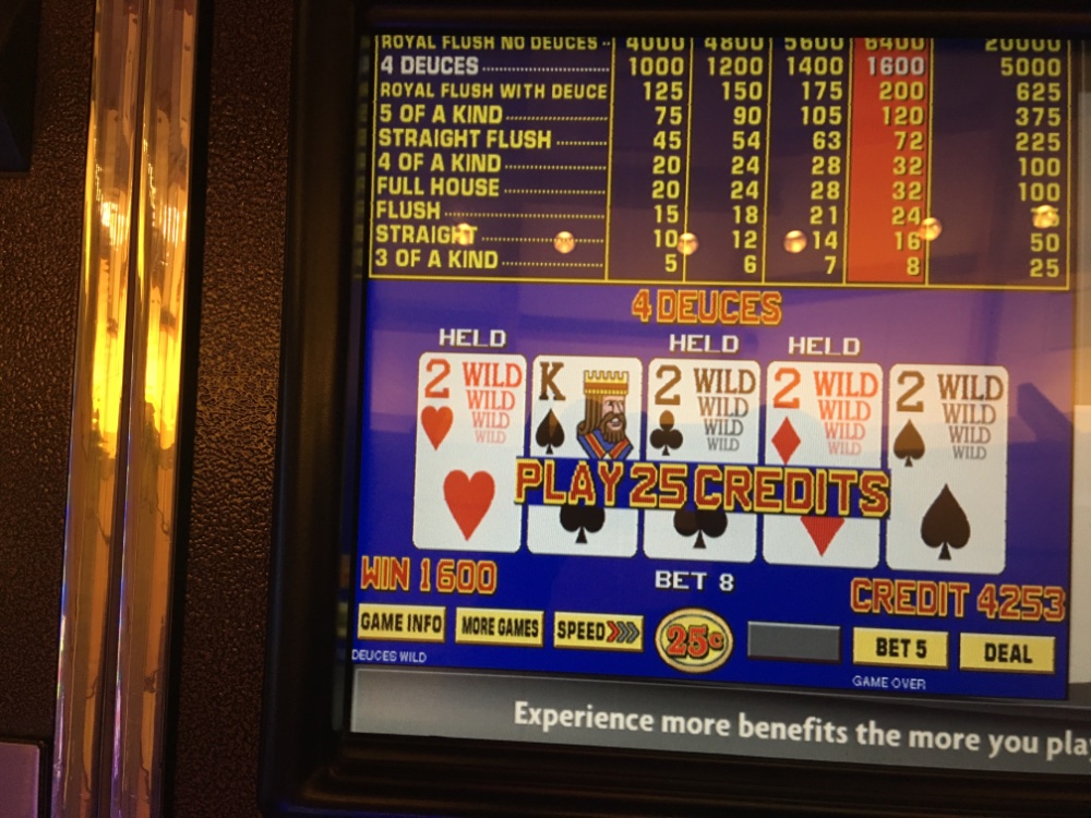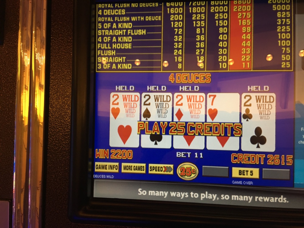 I took the hour and five minute drive up to Mohegan Sun just for the Mystery Free Play only to find out it was only fifteen bucks. Not a happy camper, I added two of my own hundreds and played about six hours. I was using a new version of Martingale Clone that I will only use on Airport Deuces. Like always, if I have a dozen or so consecutive good trips, I will post the method. This is only trip number one, but after the second quad Deuces, I didn’t hesitate a bit and drove home after a quick bite in the lounge