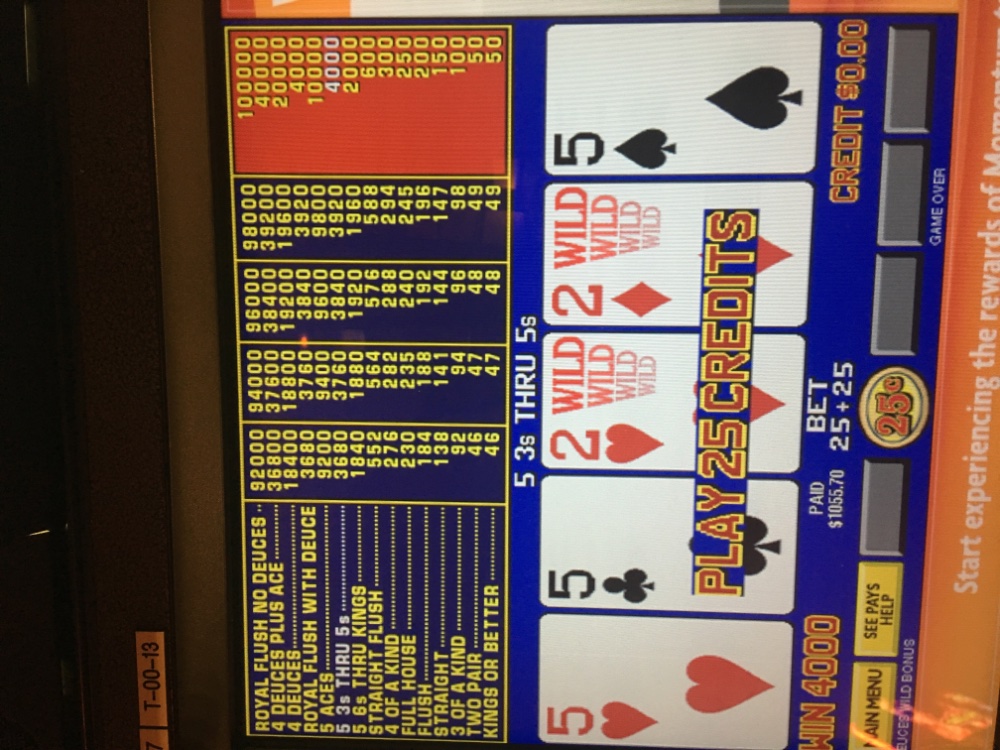 Last night at Mohegan Sun was almost a total disaster. I tried JOB, DW, and Joker kings. Was down to 200 bucks of a thousand bank and had a hunch to play DDS Bonus DW. It started terrible sort of and on this game, playing Martingale Clone gets steep fast. I was at max bet and only had 55 bucks left and it reeled in this one getting my money back.