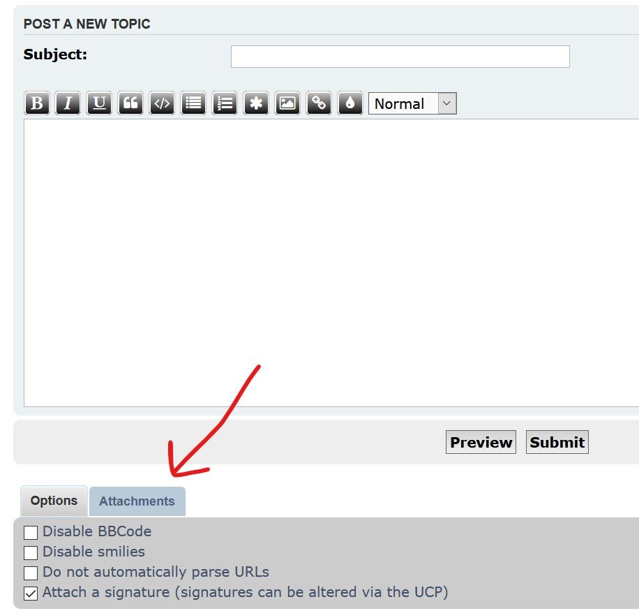 If you are starting a new topic, editing a post, or click "Full Editor & Preview" to reply to a post, then it appears in a tab below the post area as shown here.