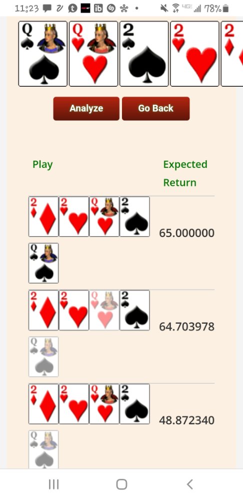 No, not when you know the exact multipliers on board. You should ideally use the multipliers given in the current hand, which was 5X for every hand.hophoofer wrote: ↑Wed Nov 18, 2020 10:33 amYour formula is clearly wrong. “So a quint with a 5X multiplier on board is worth 16 x 5 + 2 -1 = 81” It should be like this:Vman96 wrote: ↑Wed Nov 18, 2020 7:59 amHolding a quint betting 10 at UX is incorrect at all paytables except when a quint pays 80 coins without a multiplier. You must have glossed over that in my last post in this thread. When vulturing, also hold a quint at 75 coins.hophoofer wrote: ↑Mon Nov 09, 2020 11:38 pmYeah, if 5oK pays 12 instead of 15 and royal pays 20 instead of 25, hold 3 deuces if betting 5 credits.Jstark wrote: ↑Sun Nov 08, 2020 10:36 pmI had a dealt 82228 on a crappy nickel DW game the other day while picking off multipliers. The quint paid 50. Had to run the hand on the analyzer as I wasn't sure (not completely familiar with those lousy pay table DW games). It was a 222 hold. Ended up with 2 wild 4oak's and 1 redrawn quint.