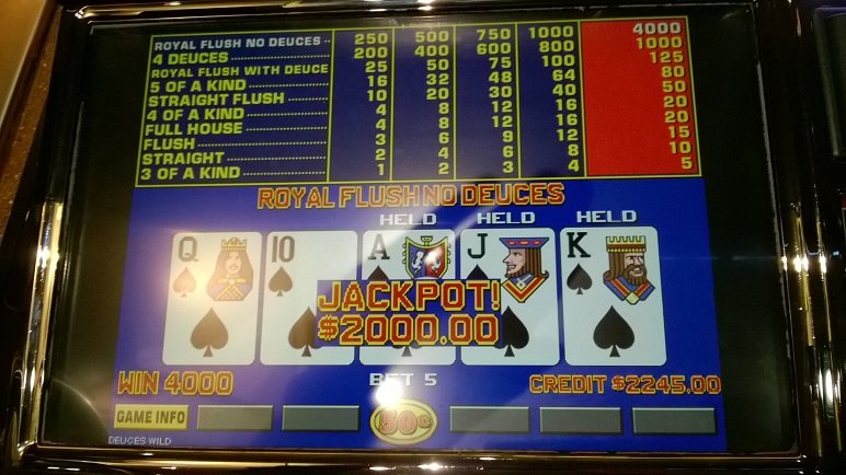 Tuesday hit one more about 8am, as the morning went on the give back was fast and furious so I dropped to 50 cent denom and wouldn't you know it a 4 to the royal comes in to roost, Royal Flush No Deuces!