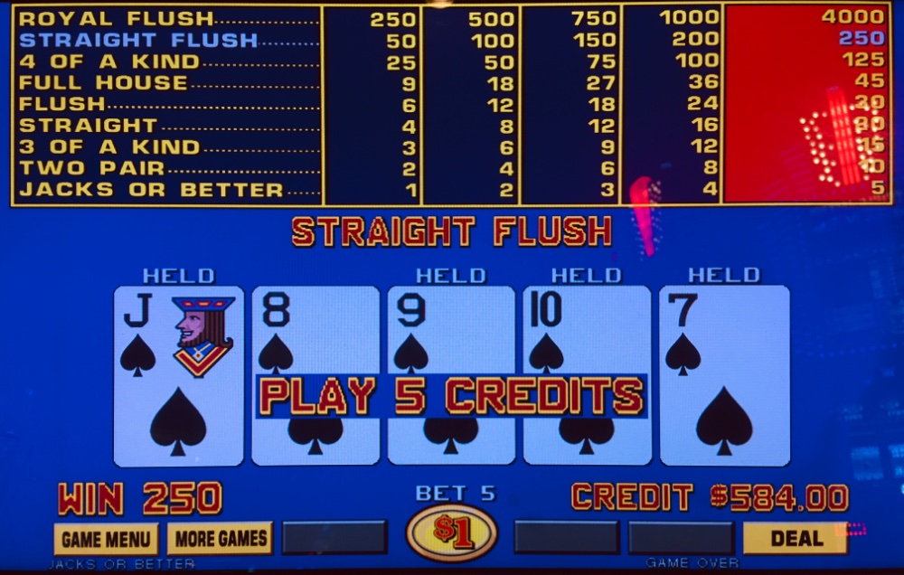 Superb Saturday. I won $16 on $25 Caesars JOB FP. I bolted for dollar and lost about $150 in the next half hour. Fortunately, I then hit a $150 quad. I lost my $25 table FP on eight to craps and left with a net zero. At Harrah’s, I again went into a rapid descent. My third quad didn’t even cover the $100 inserted. I wanted to switch machines. But just as I rose, a woman sat in it to catch her breath. I stayed and hit a max Straight Flush three minutes later! Love my pal Straight. He’s been around a lot lately. Net Day: +$135. 124 TCs.